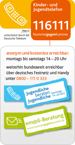 Wenn du jemanden suchst, der dir in schwierigen Momenten helfen kann, dann findest du ihn unter der bundeseinheitlichen, kostenlosen Telefonnummer 116 111, montags bis samstags 14 bis 20 Uhr.